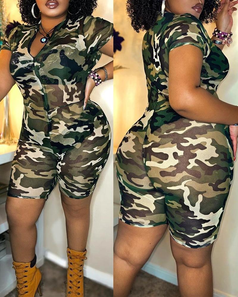 Plus Size Camouflage Print Zip Detail Romper, Green