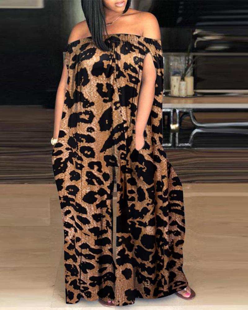 Plus Size Cheetah Print Off Shoulder Wide Leg Jumpsuit, Leopard