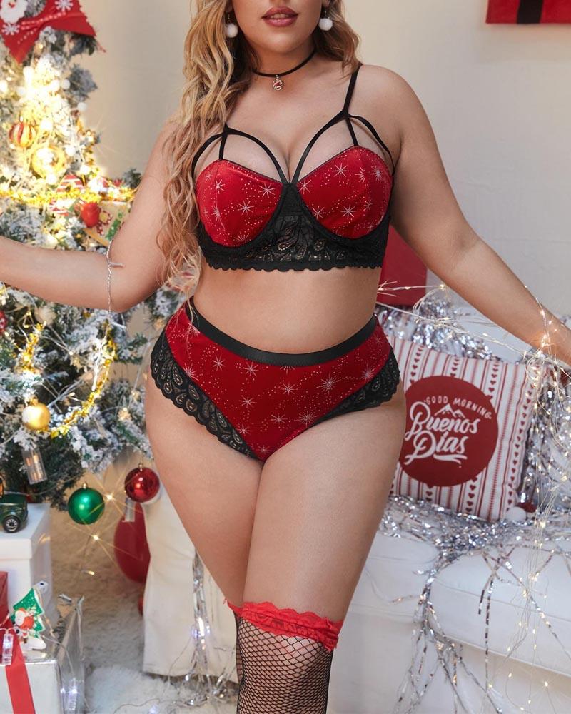 Plus Size Christmas Rhinestone Contrast Lace Lingerie Set, Red