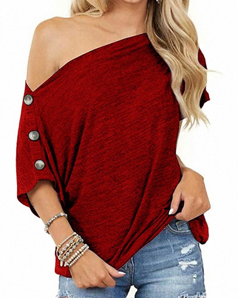 Plus Size Cold Shoulder Button Design T-shirt, Dark red