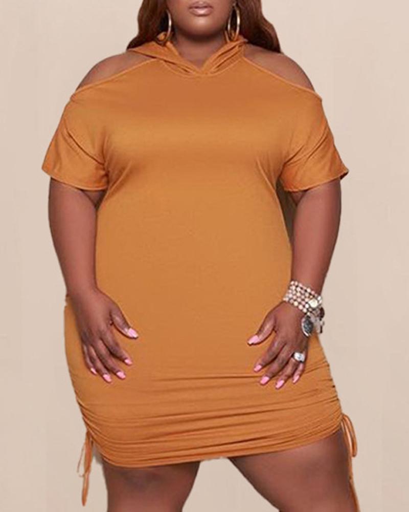 Plus Size Cold Shoulder Drawstring Ruched Casual Dress, Brown