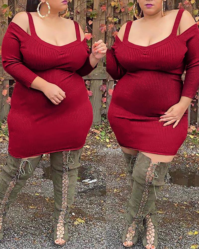 Plus Size Cold Shoulder Ribbed Bodycon Dress, Red