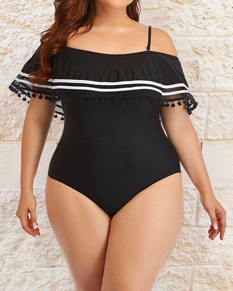 Plus Size Cold Shoulder Ruffle Hem One-Piece Swimsuit, Black