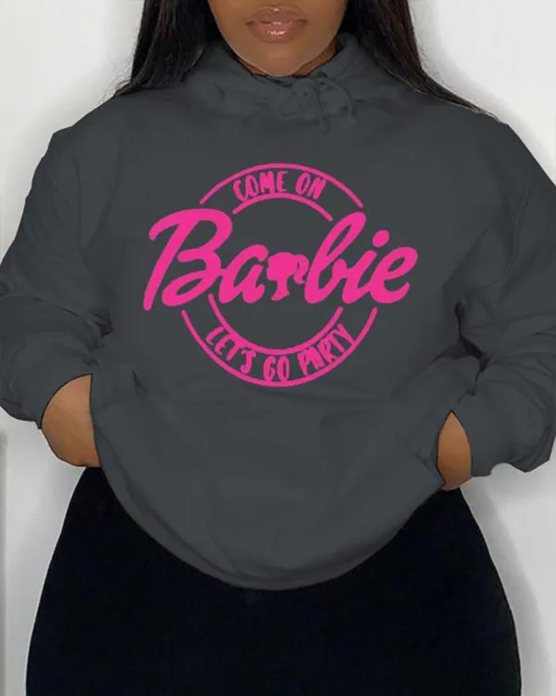 Plus Size Come On Barbie Let's Go Party Print Drawstring Sweatshirt, Gray