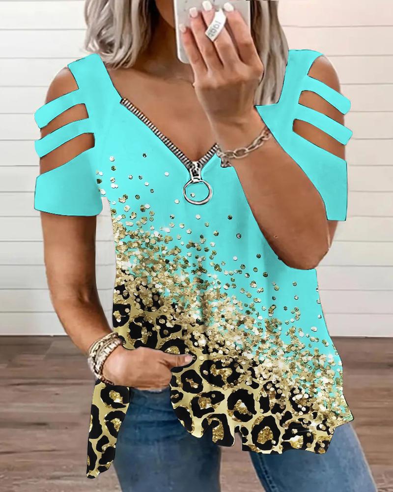 Plus Size Contrast Leopard Print Cutout Zipper Design T-Shirt, Blue