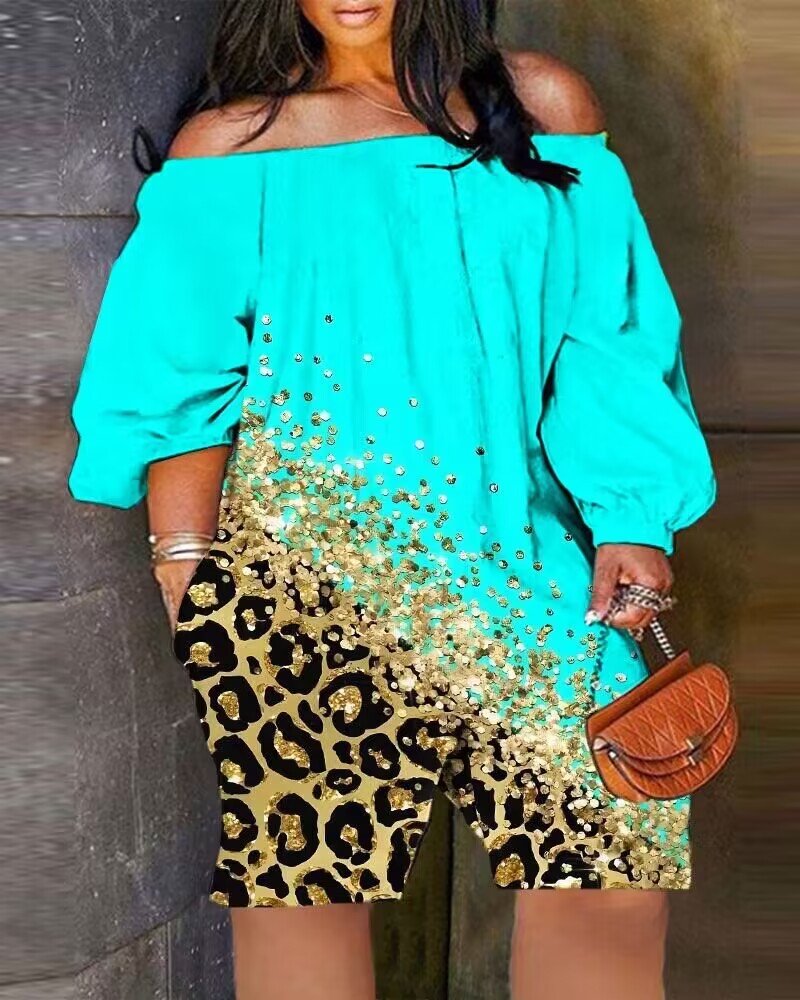 Plus Size Contrast Leopard Print Off Shoulder Romper, Blue