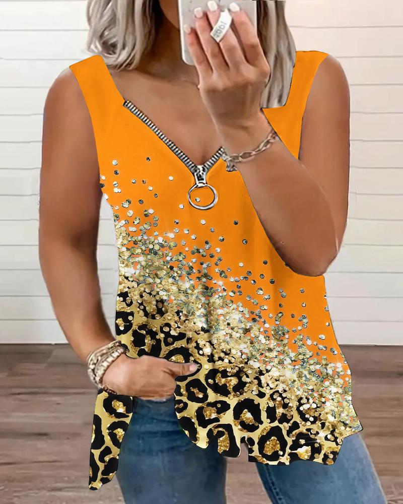 Plus Size Contrast Leopard Print Zipper Design Tank Top, Orange
