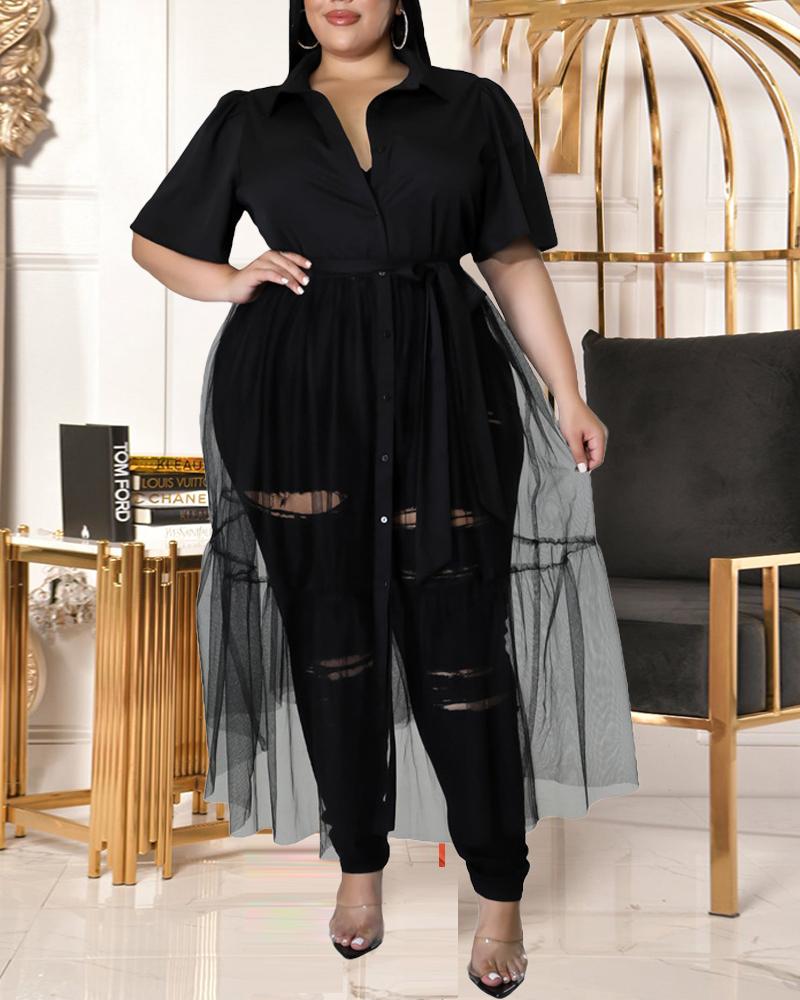 Plus Size Contrast Mesh Button Front Shirt Dress, Black