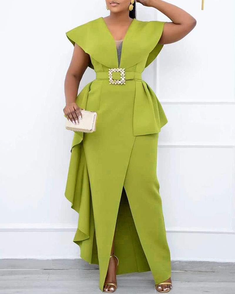 Plus Size Contrast Mesh Split Prom Dress With Belt, Green