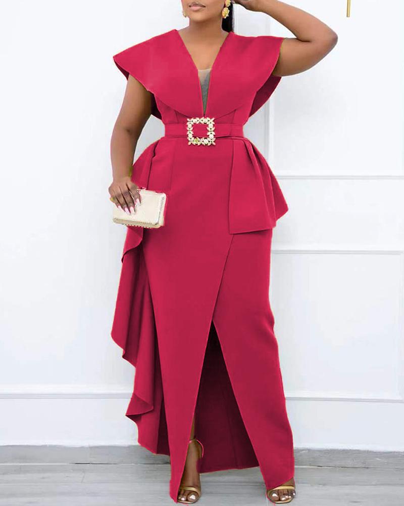 Plus Size Contrast Mesh Split Prom Dress With Belt, Red