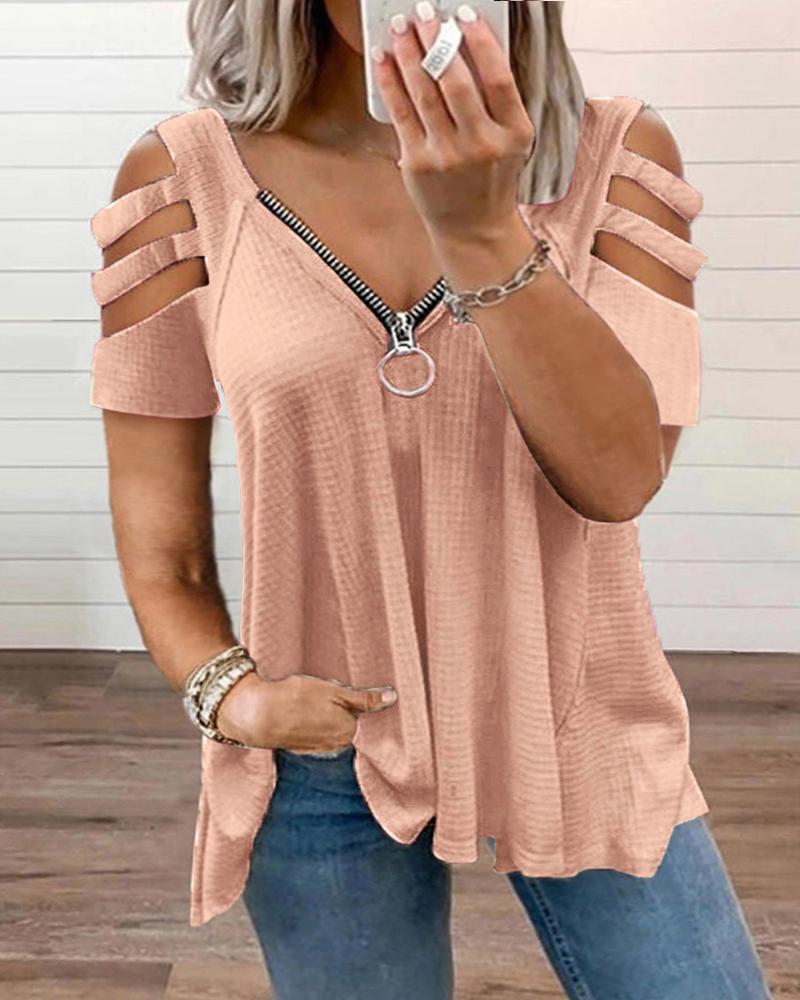 Plus Size Cutout Zipper Design Cold Shoulder T-Shirt, Pink