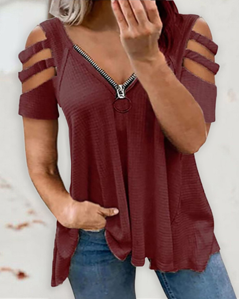 Plus Size Cutout Zipper Design Cold Shoulder T-Shirt, Wine red