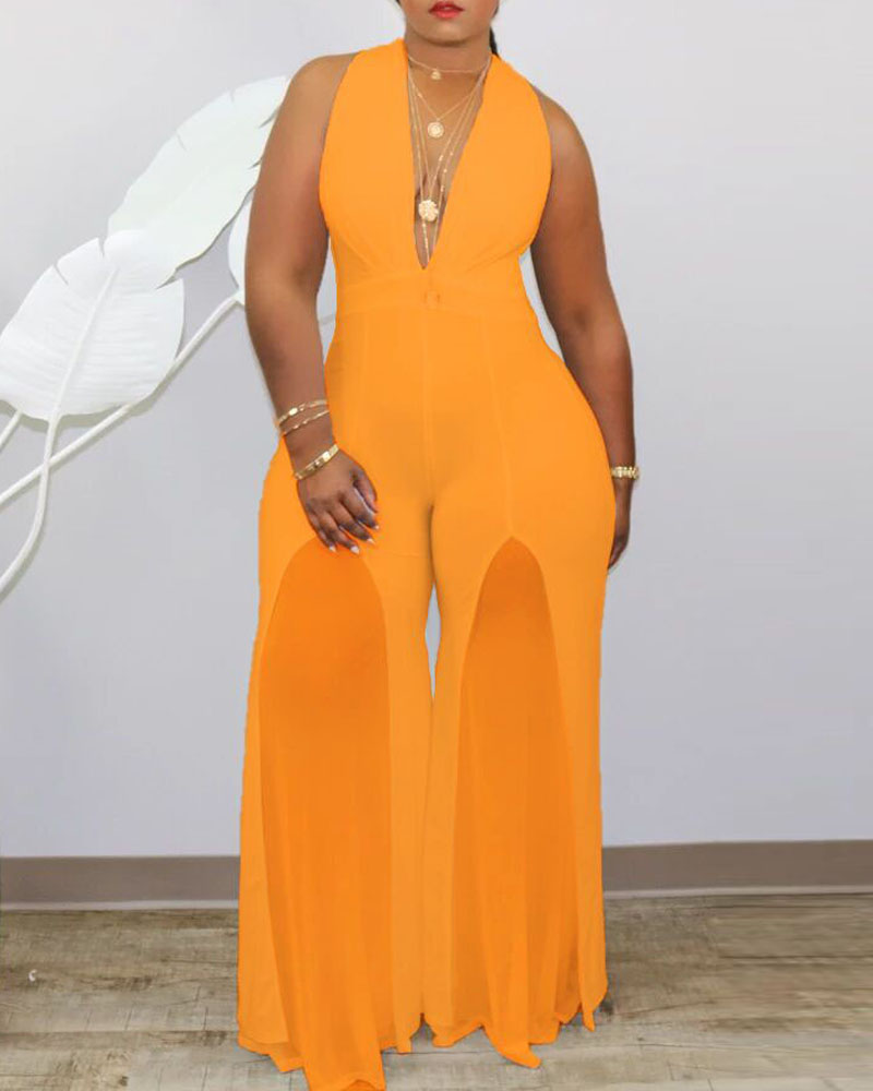 Plus Size Deep V-Neck Contrast Mesh Wide Leg Jumpsuit, Orange