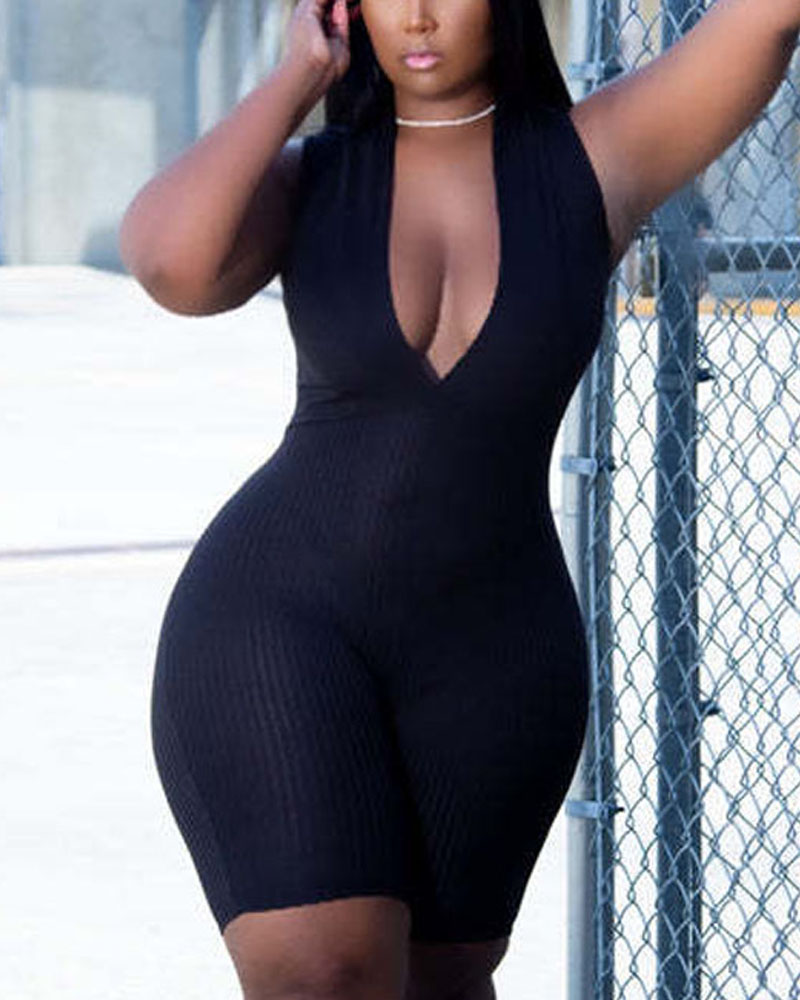 Plus Size Deep V-Neck Sleeveless Skinny Romper, Black
