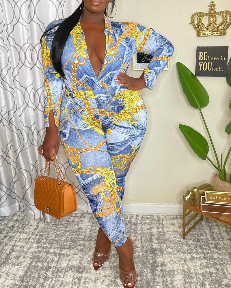 Plus Size Denim Look Chain Print Long Sleeve Jumpsuit, Blue