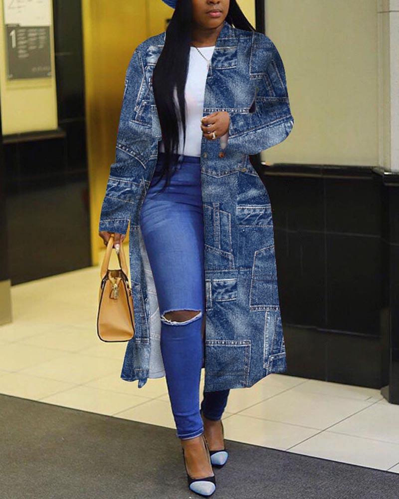 Plus Size Denim Look Print Button Front Longline Coat, Blue