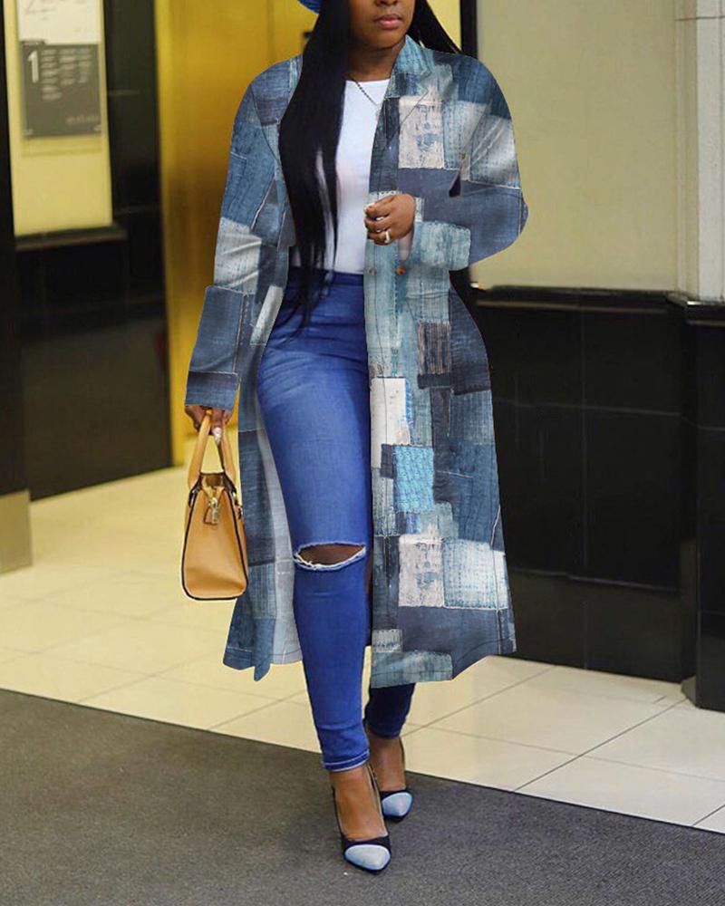 Plus Size Denim Look Print Button Front Longline Coat, Blue