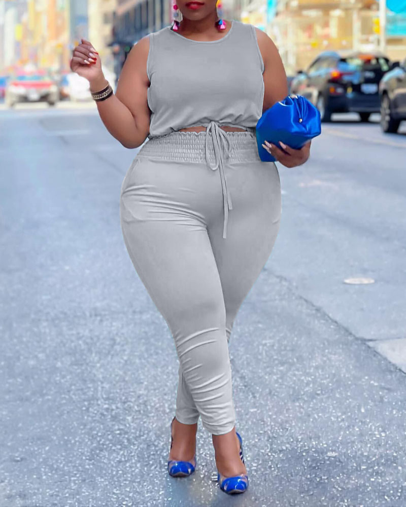 Plus Size Drawstring Design Crop Tank Top & Pants Set, Gray
