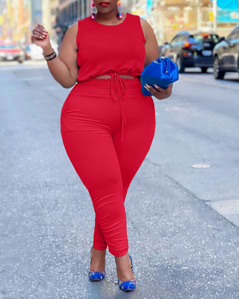 Plus Size Drawstring Design Crop Tank Top & Pants Set, Red