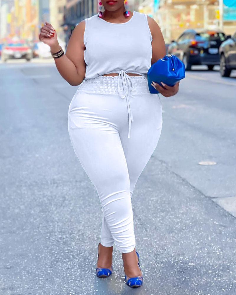 Plus Size Drawstring Design Crop Tank Top & Pants Set, White