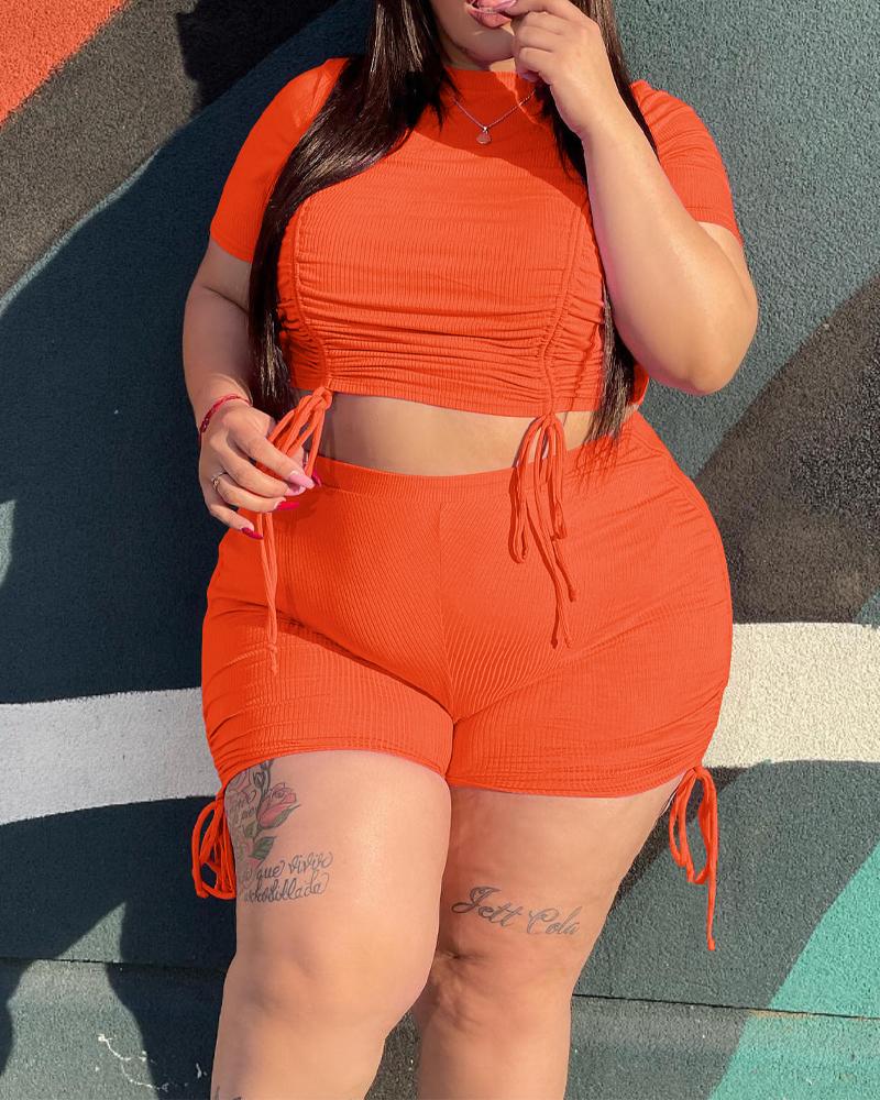 Plus Size Drawstring Ruched Crop Top & Shorts Set, Orange
