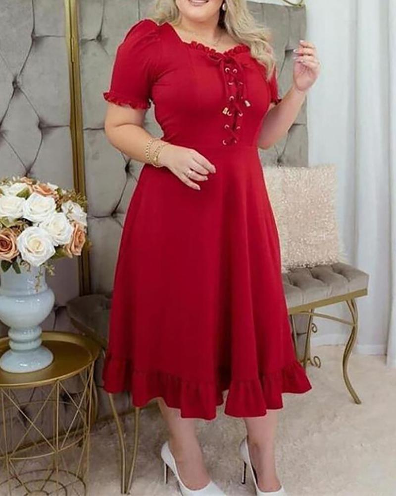 Plus Size Eyelet Lace-up Bell Sleeve Ruffles Casual Dress, Red