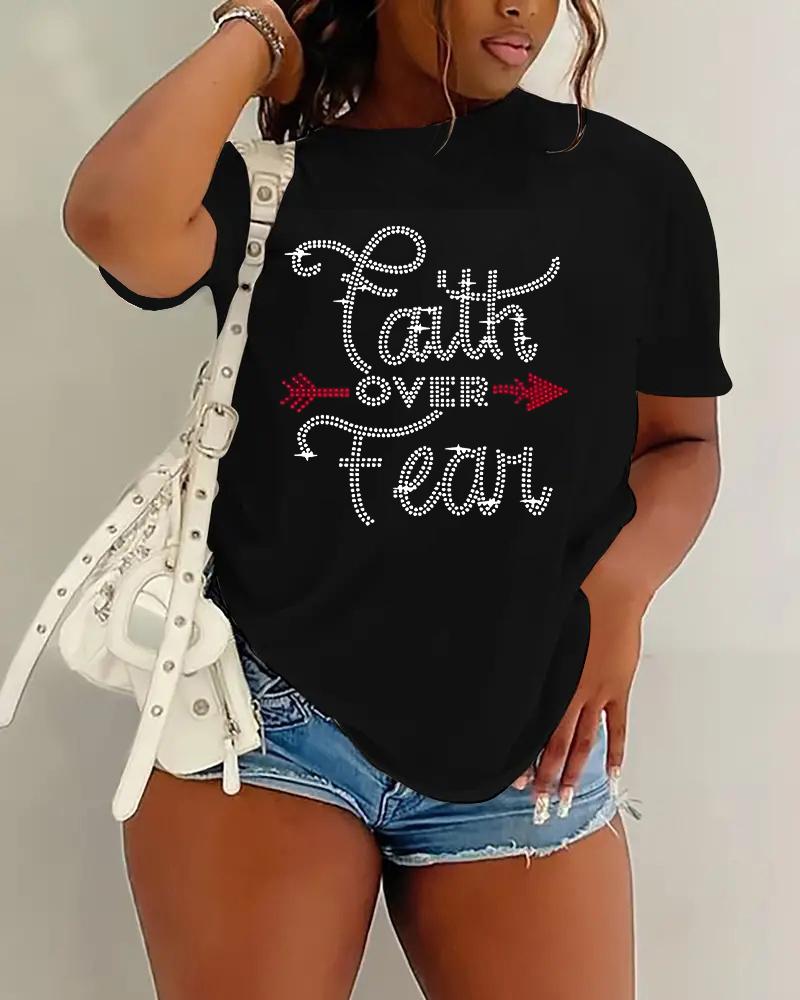 Plus Size Faith Over Fear Rhinestone Casual T-shirt, Black