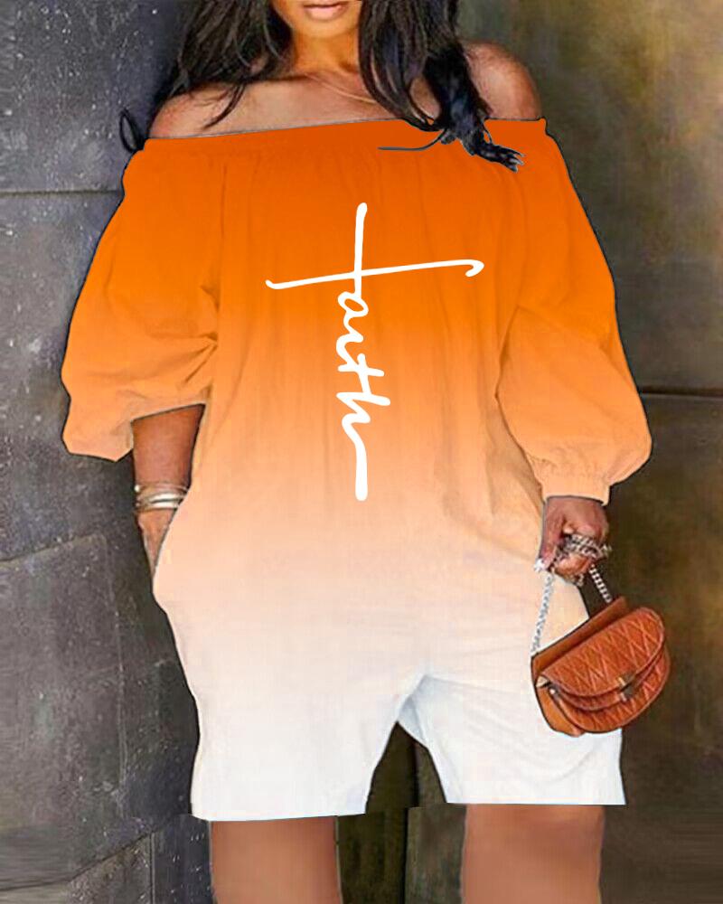 Plus Size Faith Print Ombre Off Shoulder Romper, Orange