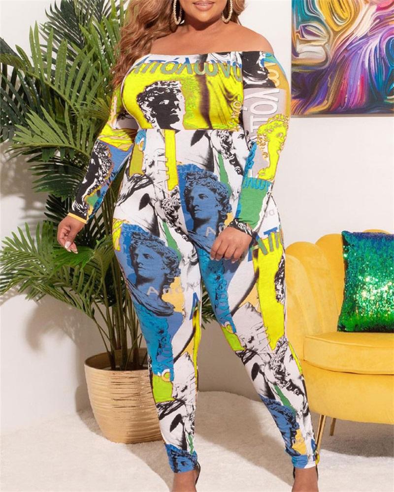 Plus Size Figure Letter Print Off Shoulder Jumpsuit, Yellow