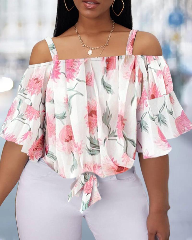Plus Size Floral Print Cold Shoulder Ruffles Top, Pink