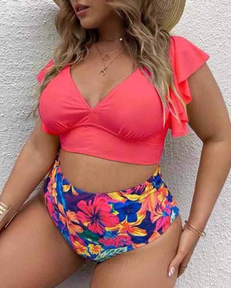 Plus Size Floral Print Ruffle Hem Bikini Set, Hot pink