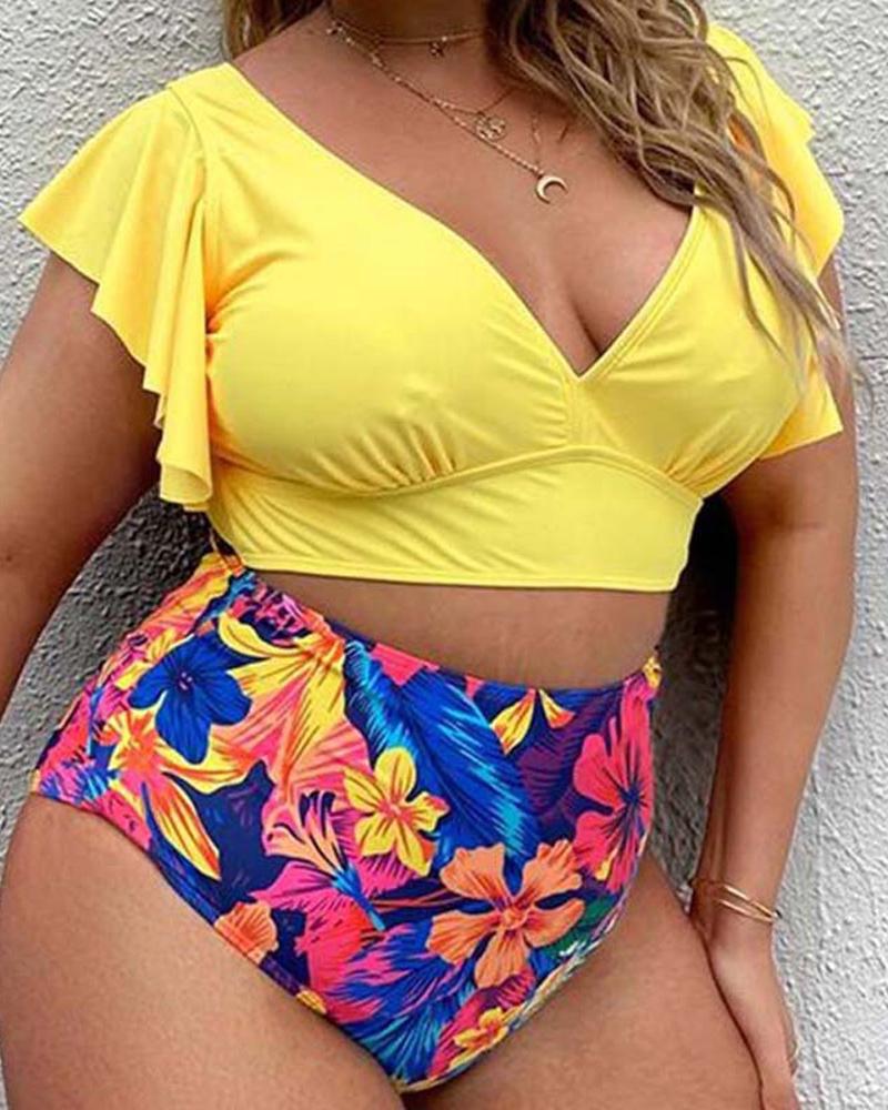 Plus Size Floral Print Ruffle Hem High Waist Tankini Set, Yellow