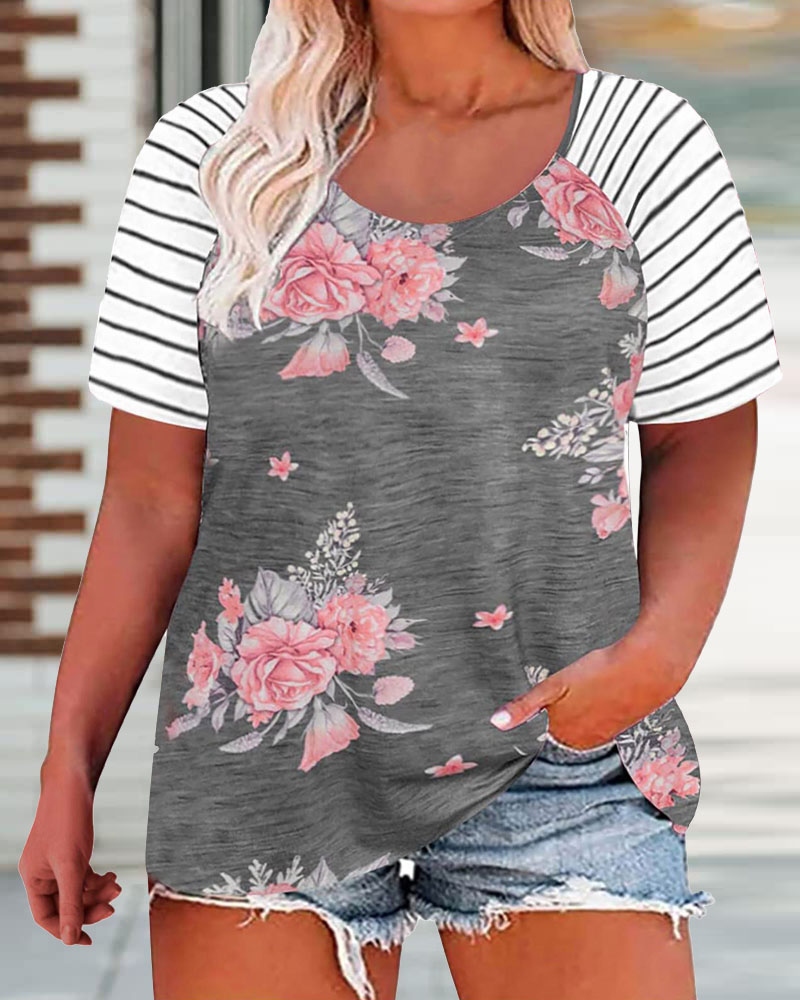 Plus Size Floral Print Short Sleeve Casual T-shirt, Gray