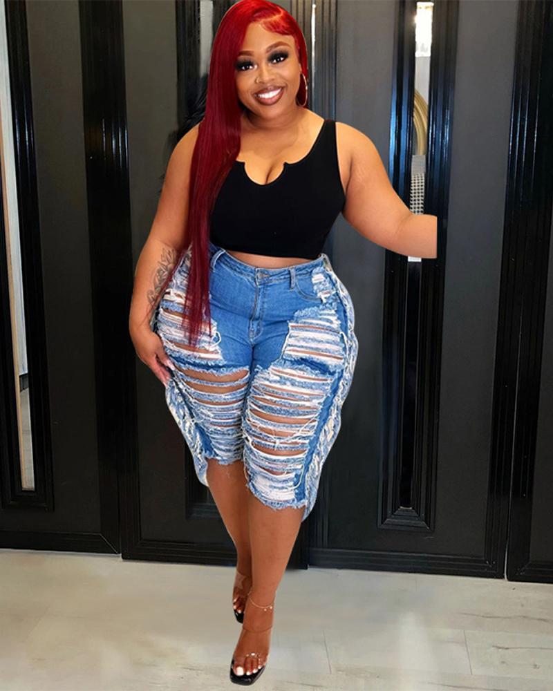 Plus Size Fringe Ripped Single Button Decor Jeans, Blue