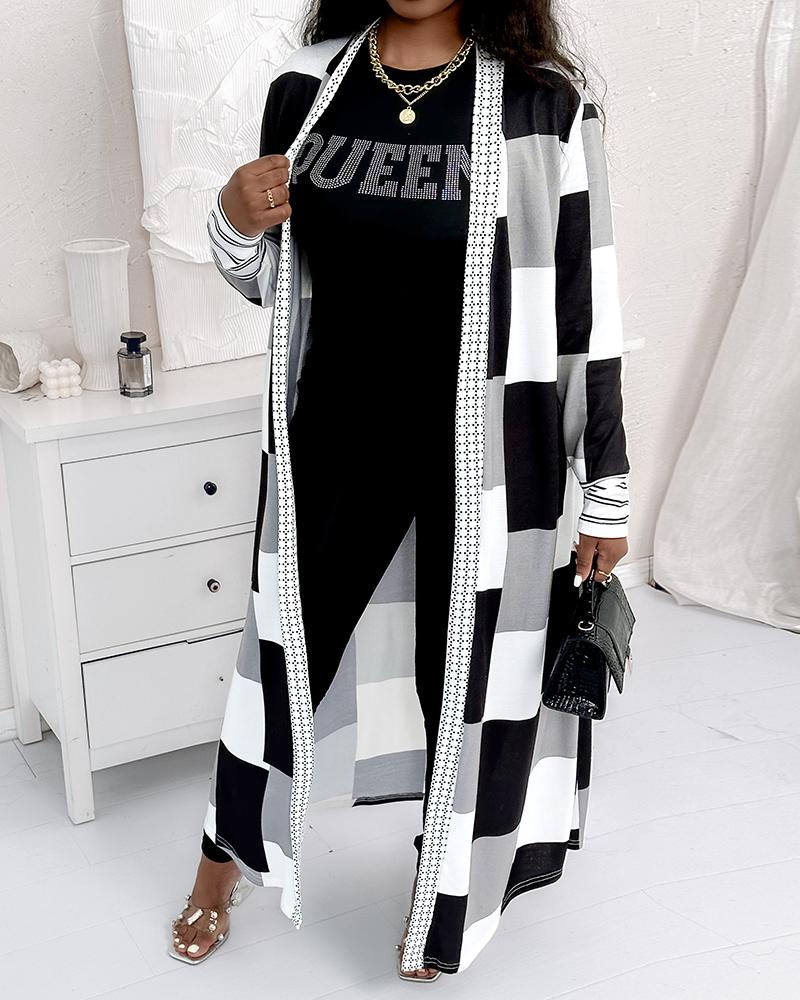 Plus Size Geometric Print Open Front Longline Coat, Blackwhite