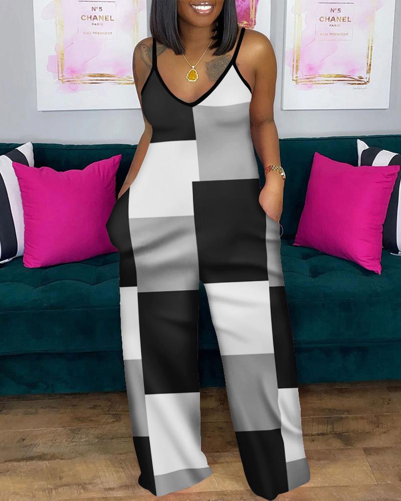 Plus Size Geometric Print Spaghetti Strap Jumpsuit, Blackwhite