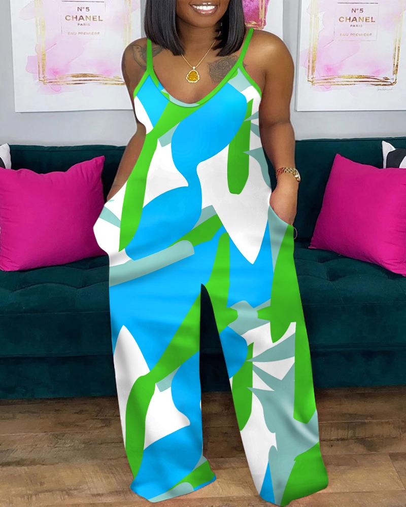 Plus Size Geometric Print Spaghetti Strap Jumpsuit, Blue
