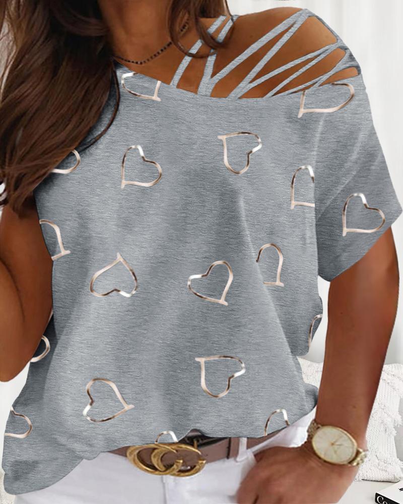 Plus Size Heart Print Cold Shoulder Top, Gray