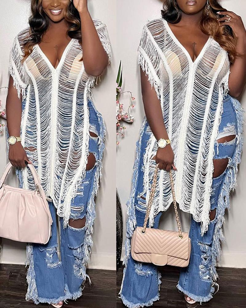 Plus Size Hollow Out Ripped Split Side Cover Up, White