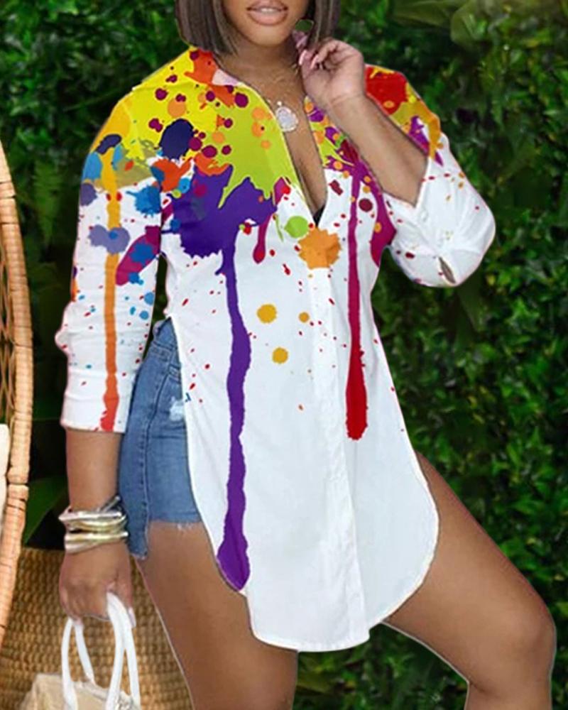 Plus Size Ink Splash Print Buttoned Long Sleeve Slit Shirt, White