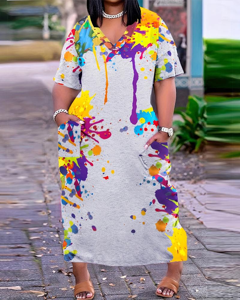 Plus Size Ink Splash Print Pocket Design Casual Dress, Gray