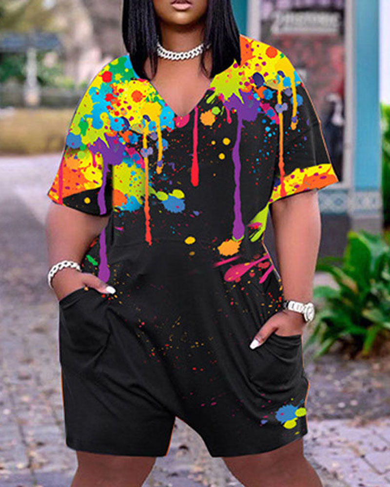 Plus Size Ink Splash Print Pocket Detail Romper, Black