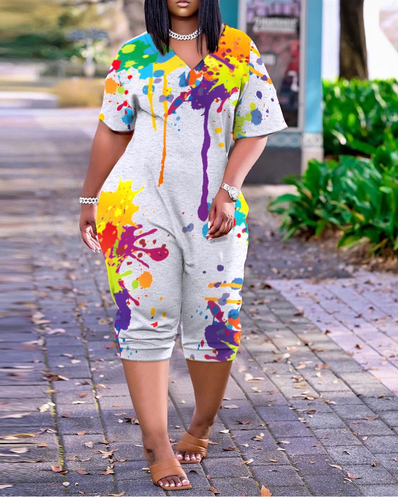 Plus Size Ink Splash Print Short Sleeve Jumpsuit, Gray