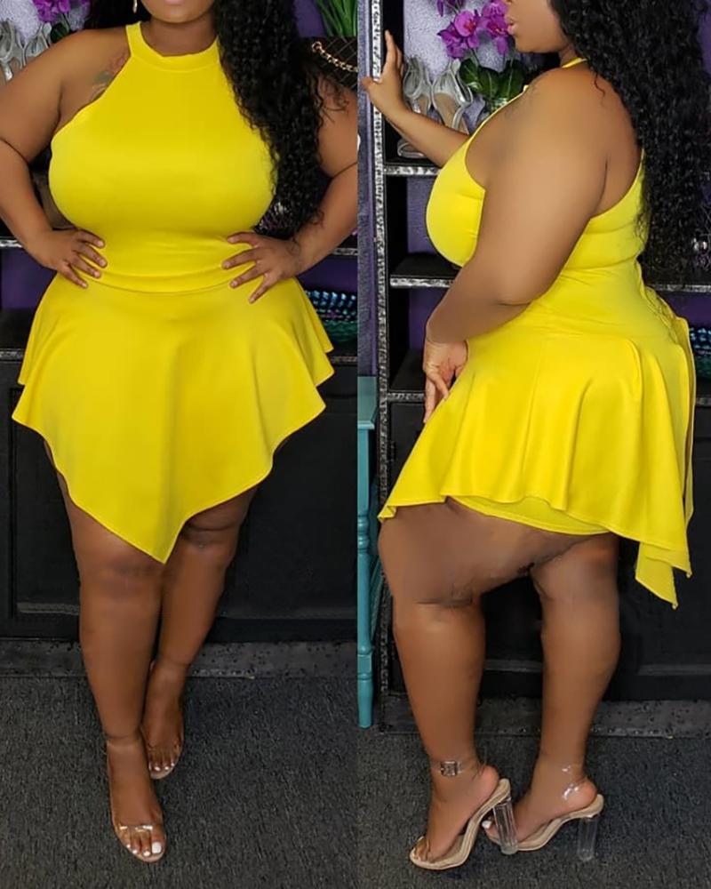 Plus Size Irregular Trim Zip Back Fake Two-piece Romper, Yellow