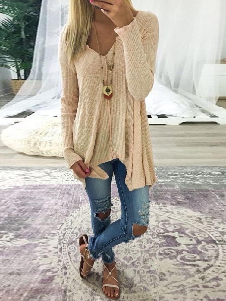 Plus Size Irregular V Neck Rib-knit Sweater, Khaki