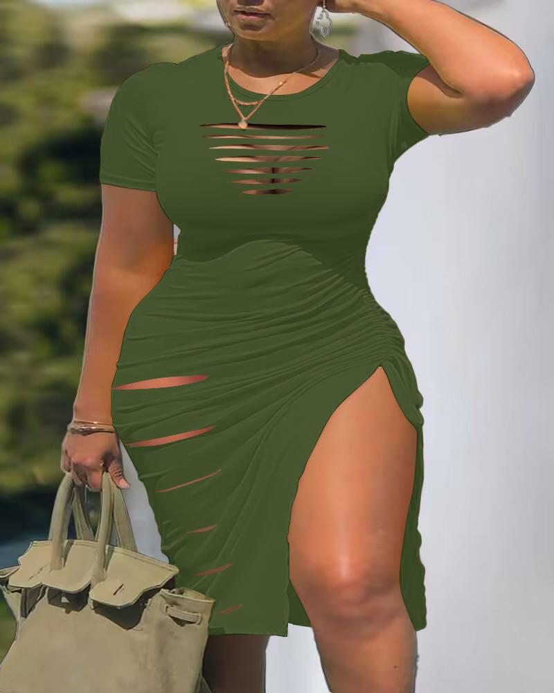 Plus Size Ladder Cutout Drawstring Ruched High Slit Dress, Army green