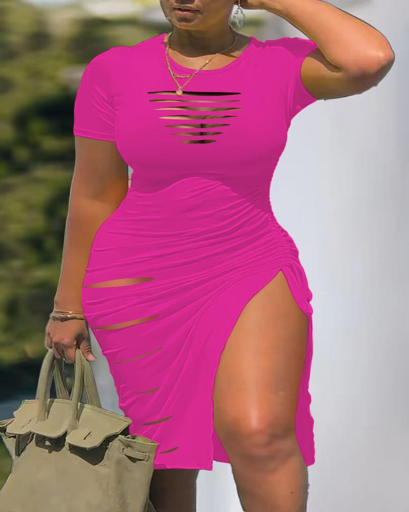 Plus Size Ladder Cutout Drawstring Ruched High Slit Dress, Hot pink