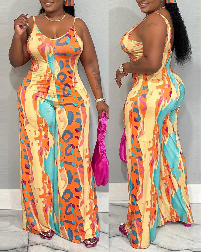 Plus Size Leopard Ink Splash Print V-Neck Wide Leg Jumpsuit, Yellow