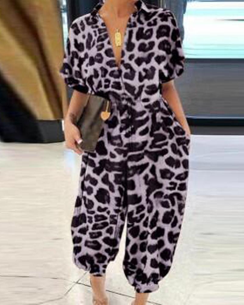 Plus Size Leopard Print Button Front Jumpsuit, Purple