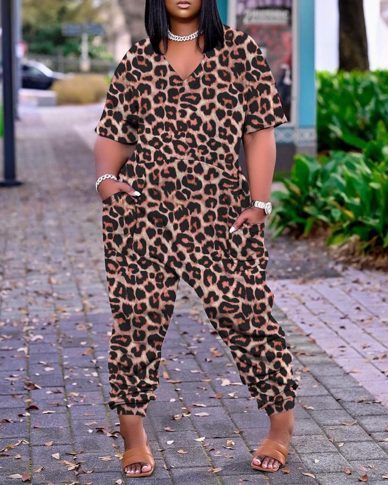 Plus Size Leopard Print Pocket Detail Jumpsuit